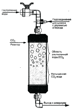 Проточные реакторы. Существенные преимущества и прежде всего повышенную производительность дают реакционные системы двуокиси углерода, через которые протекает вода. Их можно использовать как для установления в аквариуме так и для больших установок, для помещения снаружи корпуса. При этом речь идет о трубе, которая содержит наполнитель и которая служит для того, чтобы гарантировать оптимальный контакт между двуокисью углерода и водой.