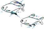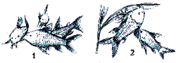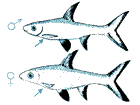 На рисунке показаны различия в форме анального плавничка живородящих рыб. Самец (сверху) мельче самки и имеет свернутый в трубочку, вытянутый и заостренный анальный плавник. Первые недели жизни этот плавник и у самца развернут флажком. Но по мере формирования пола он превращается в гоноподий, при помощи которого самец оплодотворяет самку. На рисунке этот орган показан крупнее. Нужно сказать, что строение гоноподия не у всех живородящих рыб одинаково, поэтому не всегда возможно естественное скрещивание. Например, скрестить гуппи и моллинезию можно только путем искусственного осеменения. Зато пецилии и меченосцы прекрасно скрещиваются, давая новые вариации форм и окрасок. Если нужно подобрать самца и самку у черных моллинезий, у которых, естественно, не видно родового (просвечивающегося) темного пятна, как у самочек гуппи, следует обращать внимание на форму этого плавничка, особенно во время движения рыб вперед. Очень скоро можно научиться отличать по этому признаку и пецилий, и приапелл, и меченосцев в молодом возрасте (когда у самцов еще не отросли мечи) и гуппи, когда самцы не начали окрашиваться.