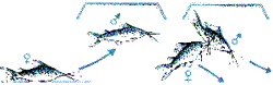 Схема поведения золотых сомиков в период нереста: 1 - оплодотворение икры; 2 - прикрепление икры к субстрату самочкой