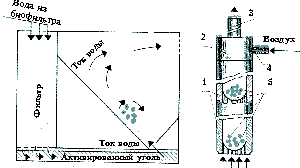 Конструкции инкубатора икры малавийских цихлид: 1 - камеры (составные); 2 - крышка; 3 - водоотводящая труба; 4 - подача воздуха от микрокомпрессора; 5 - инкубирующаяся на протоке воды икра