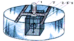 Аквариум с инжекторным устройством для разведения пелагофилов: 1 - моторчик; 2 - кронштейн; 3 - ось; 4 - сетчатая защита; 5 - винт