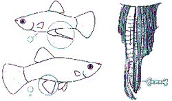 Пол у живородящих рыбок определяется по анальному плавнику: слева - самец и самка; справа - копулятивный орган самца живородящих - гоноподий